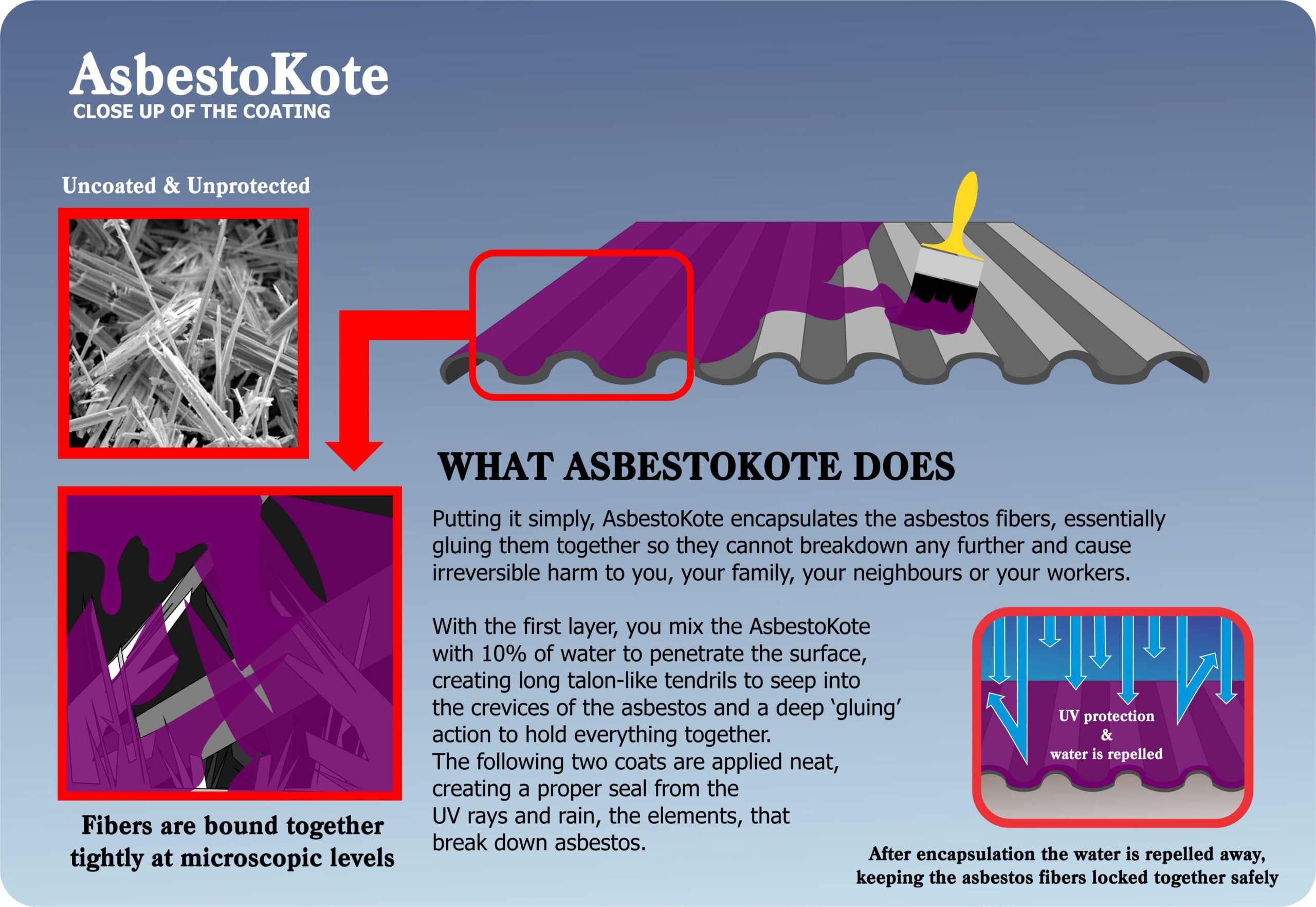 Encapsulation requires a simple process of "painting" the surface with an approved binder of which our AsbestoKote is the choice because of its extreme efficacy in binding all the fibers within and upon the surface of asbestos sheeting.